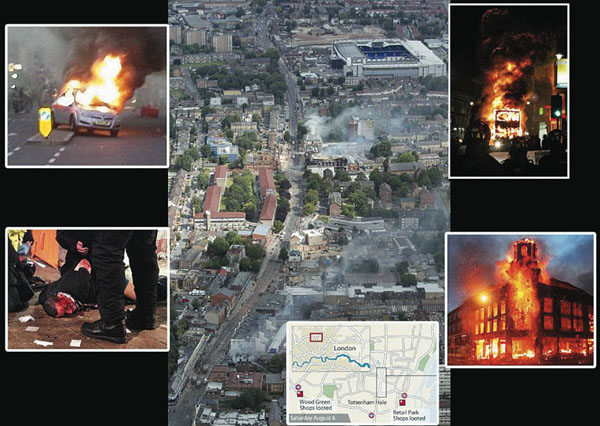 Поджоги, грабежи убийства продолжались несколько ночей. В беспорядках приняли участие все слои британского общества, но особенно много молодёжи — начиная с дочери миллионера и заканчивая подростками из гетто. Премьер-министр Дэвид Камерон вынужден был прервать свой отпуск. Парламент собрался на внеочередную сессию. На улицы Британской столицы власти вывели более 16 тысяч полицейских, им разрешили использовать водомёты против мятежников. За время беспорядков было задержано более тысячи человек. Сотни тысяч фунтов составил непосредственный ущерб от поджогов и грабежей.